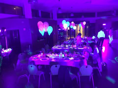 Nous mettons en place de multiples projecteurs de lumière noire, un grand stand de maquillage peinture fluo et un ensemble de sonorisation avec jeux de lumière.