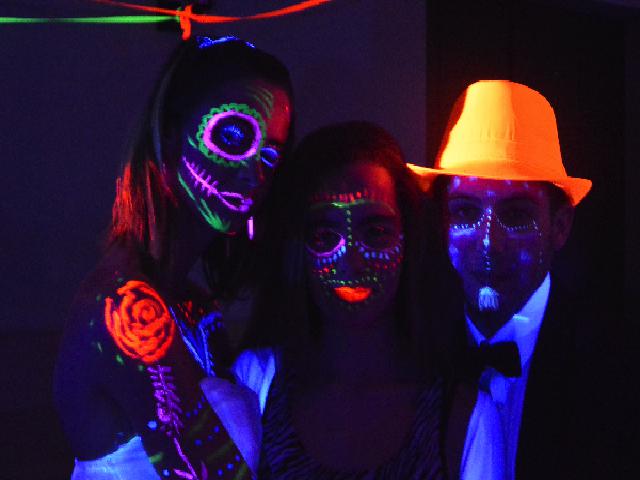 Nous mettons en place de multiples projecteurs de lumière noire, un grand stand de maquillage peinture fluo et un ensemble de sonorisation avec jeux de lumière.